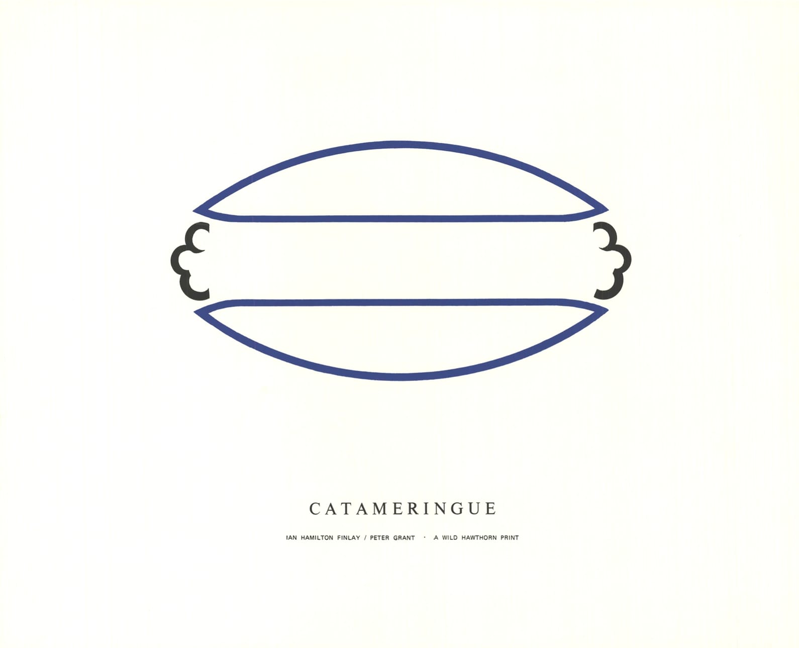 As for Catameringue (and leaving aside thoughts of slapstick comedy) even if it does provide more of an initial “wham”, the possibility of “slow excitement” remains. It doesn't take much familiarity with Finlay's output to appreciate the potential he found in the medium of printmaking, as he did in the many others he employed. As ever, the print is precisely conceived and realised, from the minimal symmetry of the meringue/ hull shapes, in what looks like navy blue, to the stylised puffs representing whipped cream/ aquatic wash, and from the careful placing of the texts, including the clinching pun, to the typeface and script. Considered in its guise as a catamaran, the “puffs” rather oddly appear at both bow and stern, which seem to be interchangeable – but of course it is also a meringue.