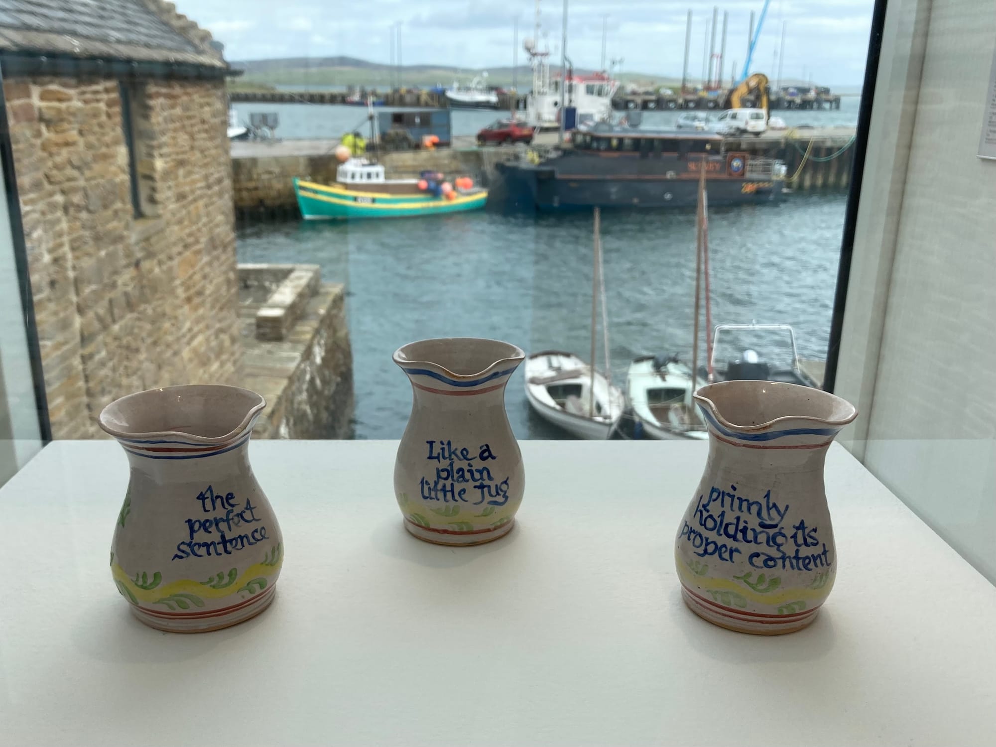 The Pier Arts Centre's centenary exhibition of work by Ian Hamilton Finlay closes on Saturday, and the loan to the gallery of a set of three ceramic jugs has made a charming, and as ever thought-provoking addition to the display.