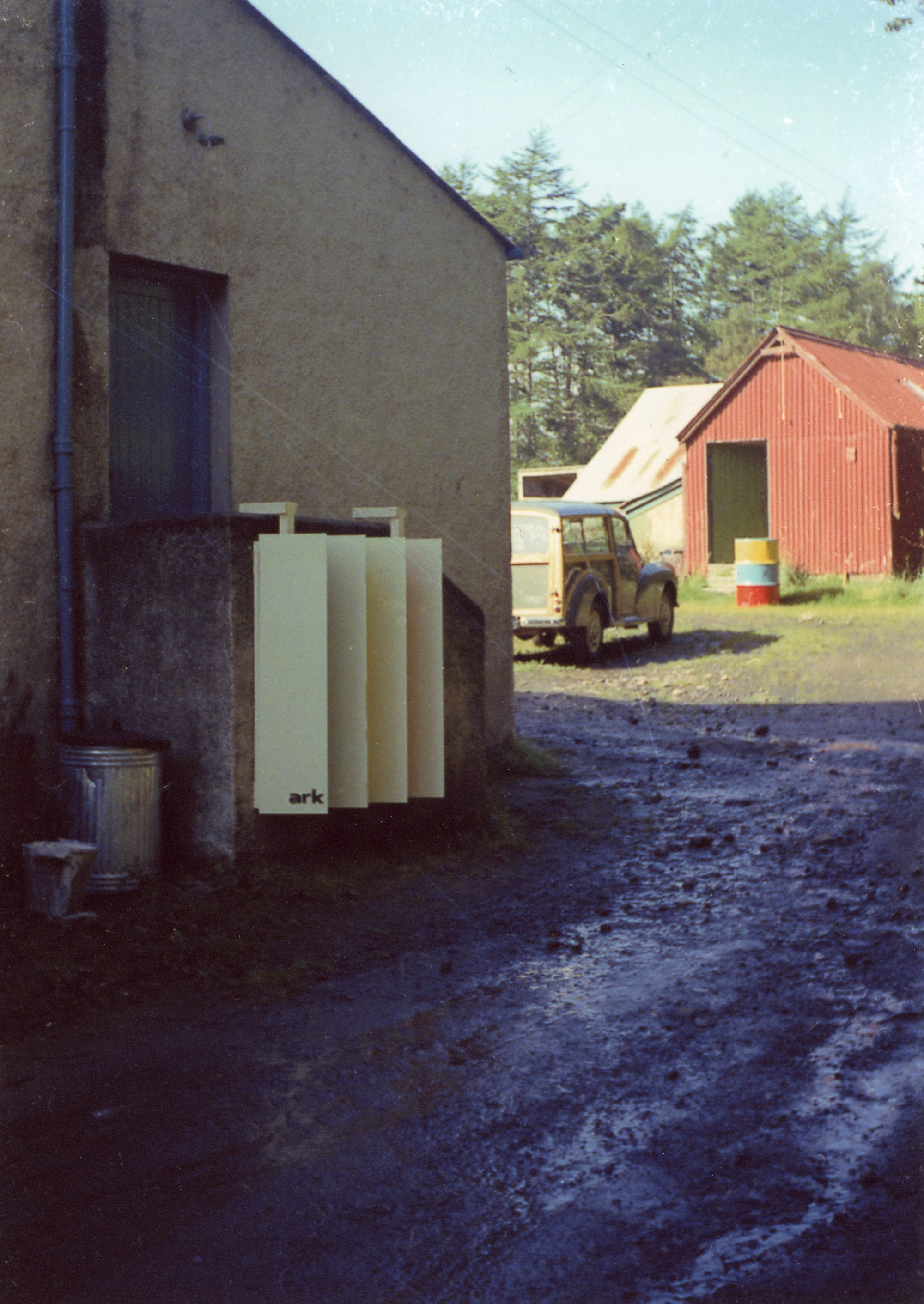 Colour clearly mattered at this time, something which at Little Sparta, though enhanced in many areas with sympathetic plantings, gives way to a pervading green. At Gledfield, ark/arc was a vibrant translation of a leaflet-poem into kinetic sculpture, suspended on the balustrade of a flight of steps. Composed of panels painted in primary red, yellow and blue, they reflect their colour onto adjacent white panels, contained at either end by the titular ‘ark’ and ‘arc,’ a playful convergence of subjective perception and the impersonal word. Though the Finlays’ time here was short, it was productive, Bann being inspired to characterise the year’s residence as “an overture” to the great opera to come.