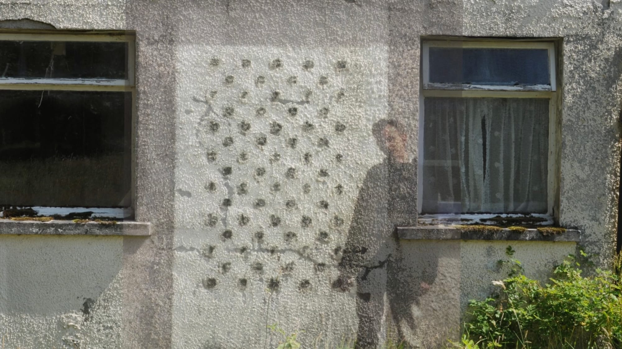 Joined by Stephen Bann, an art historian and close friend of Finlay’s, the pair pick over the long abandoned site for any signs which might point to the poet’s activity here. It takes brave imagination; the traces of his presence are barely detectable. Largely unseen archival photographs are deployed to help in the imaginative reconstruction, and they lead us to rough marks left on a crumbling section of the house’s wall where Finlay first installed his concrete poem acrobats, the dancing net of letters which spell out the word in diagonals; now a spaced out and shadowy chequerboard, all letters removed. It is no accident that these traces are hard to find, Finlay removed the work and all others that he’d made at Gledfield after a fall-out with the landlord led to the Finlays leaving the place, moving to Stonypath not long after. But, as Peebles helps us to envisage, other works were made here, and interspersed through the film are interviews with friends and collaborators who give shape to Finlay’s actions and influences.