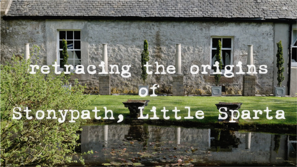 LITTLE SPARTA, the landscape garden at Stonypath in the Pentland Hills, is widely regarded as the master-work of the Scottish artist, poet and gardener Ian Hamilton Finlay (1925-2006). Removed from Edinburgh by some 25 miles, this complete synthesis of his artistic vision is as equally composed of soil, water and plant matter, as it is of the numerous stone, ceramic and wooden “concrete poems” which fill it. Such is the integrity of the place as a sort of gesamtkunstwerk that one might forget to wonder about its genesis. Did the idea of its making simply spring up unheralded upon Finlay’s arrival at Stonypath, or had the possibility of such a fusion of poetry and physical context already been brewing elsewhere?